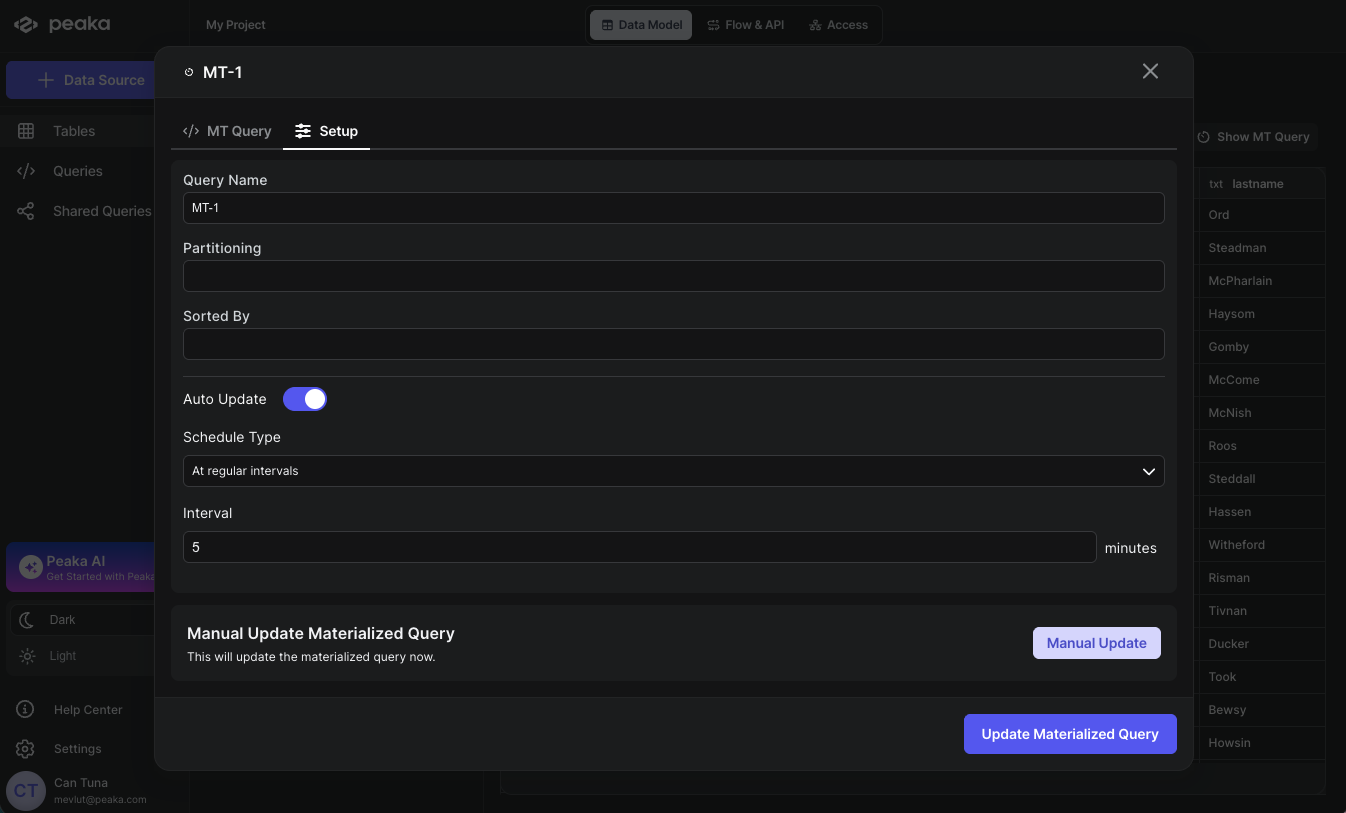 You can modify various settings for your materialized queries to optimize performance and control refresh behavior.- Navigate your materialized query in the right side panel under the “Tables” section and click on the Show MT Query button.