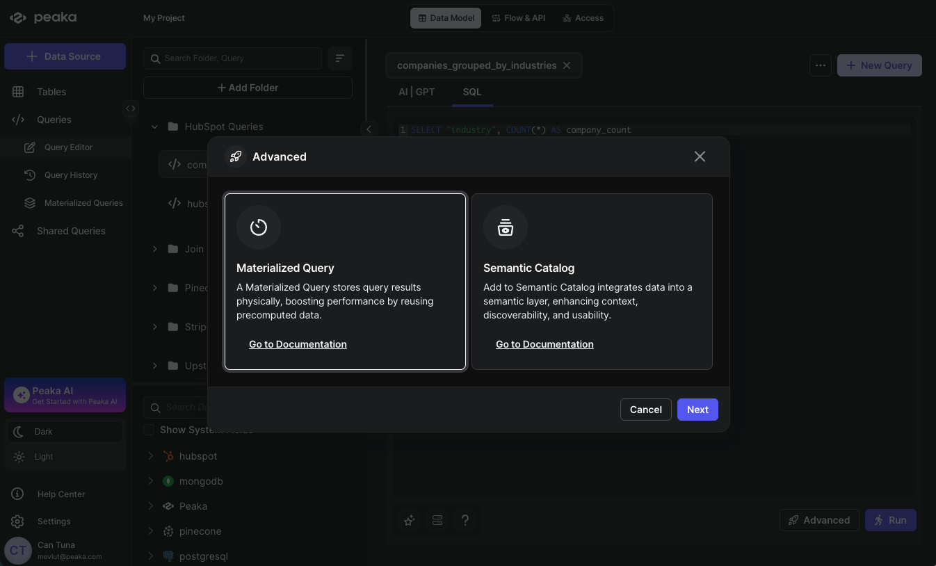 To create a Materialized Query, you can follow these steps:- Navigate to the Query Editor located in the right side panel and then select your query which you want to materialize.