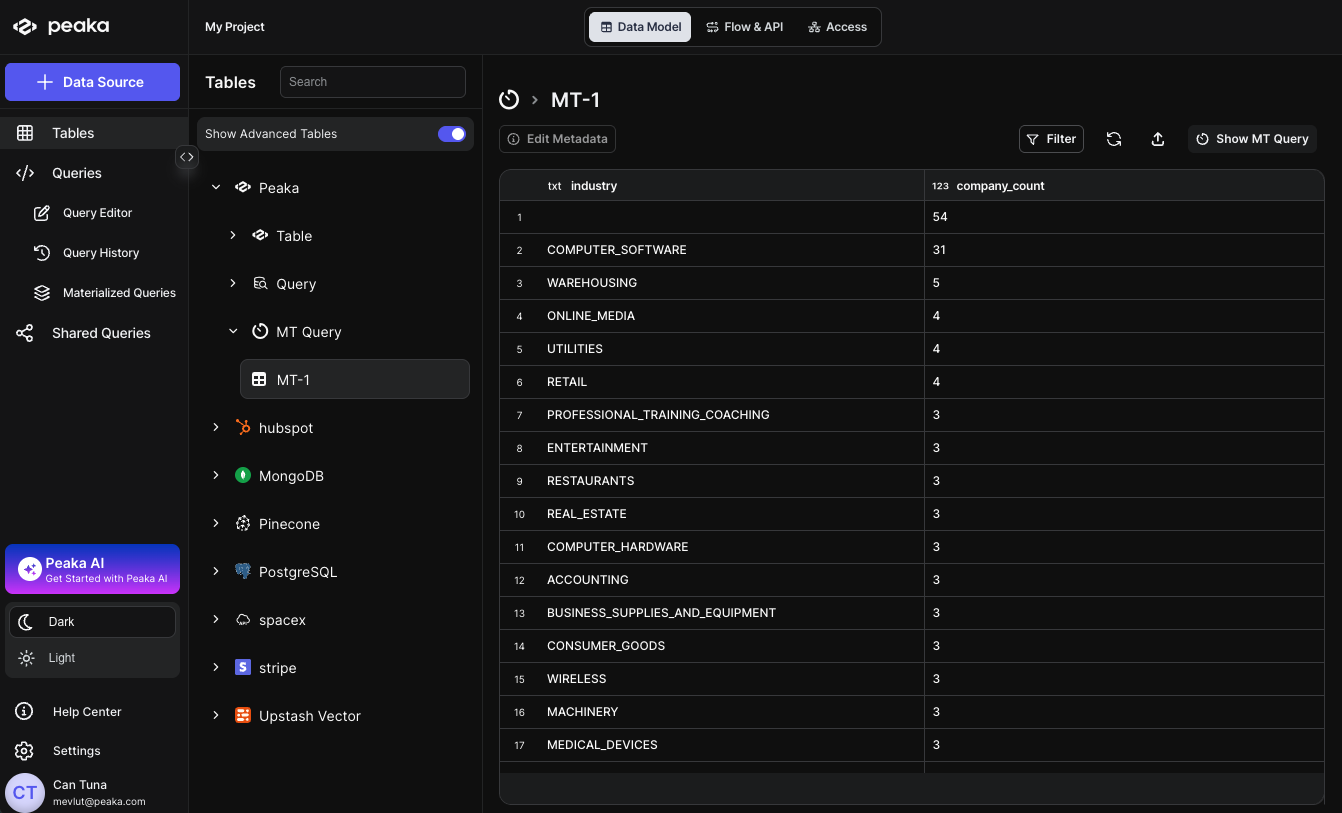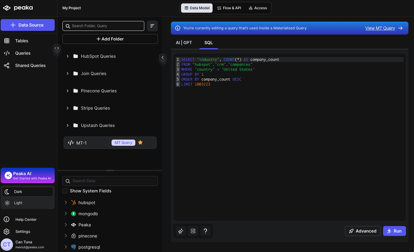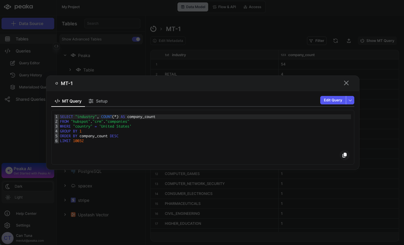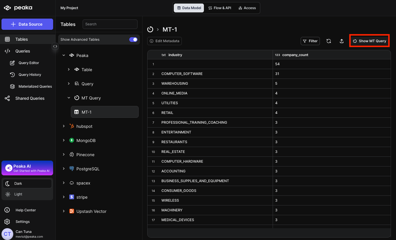 You can manually refresh your materialized query to get the latest data without waiting for the scheduled update.- Navigate to your materialized query in the right side panel under the “Tables” section and click on the Show MT Query button.