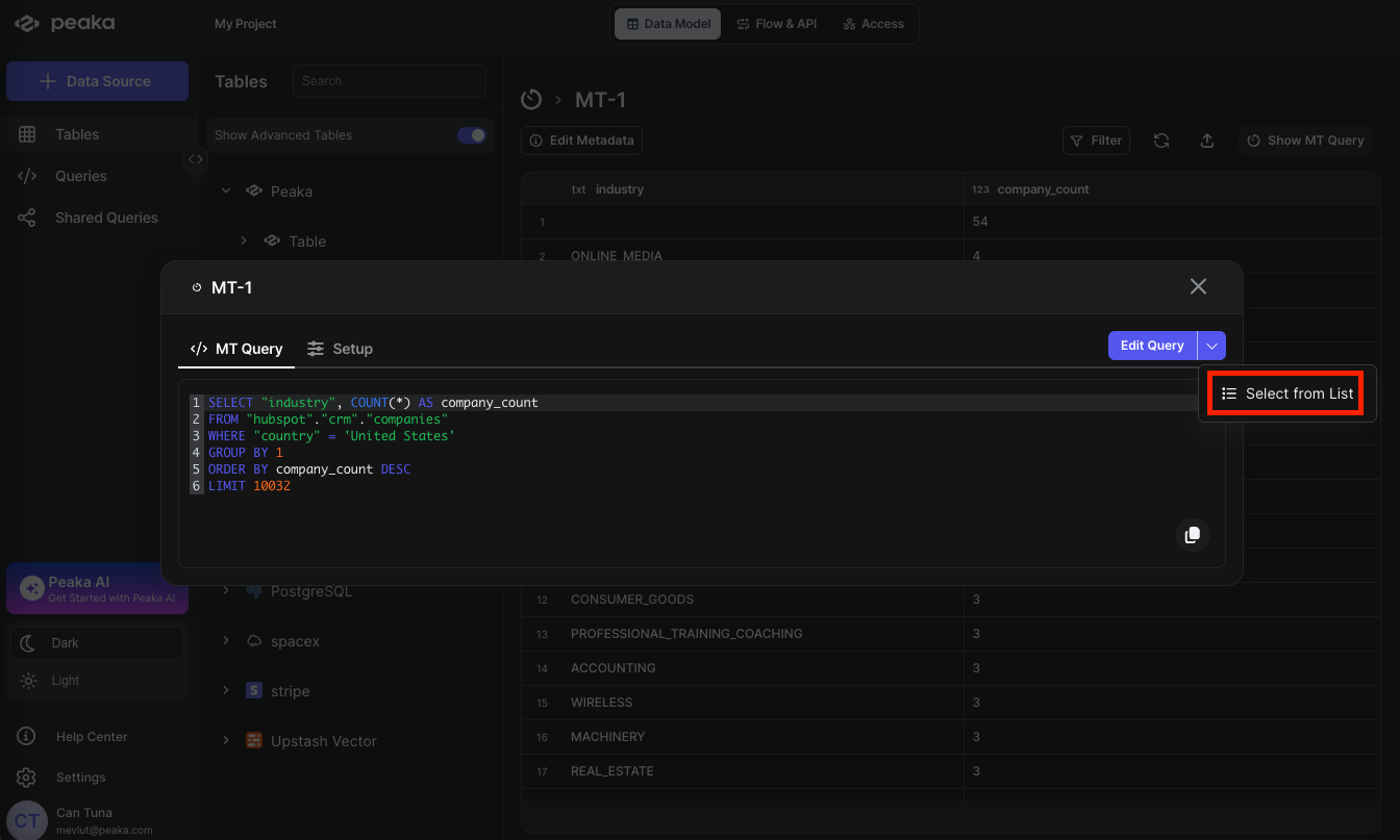 - A modal will open displaying the materialized query details. Click on the dropdown button next to the Edit option and select “Select from List” from the dropdown menu.