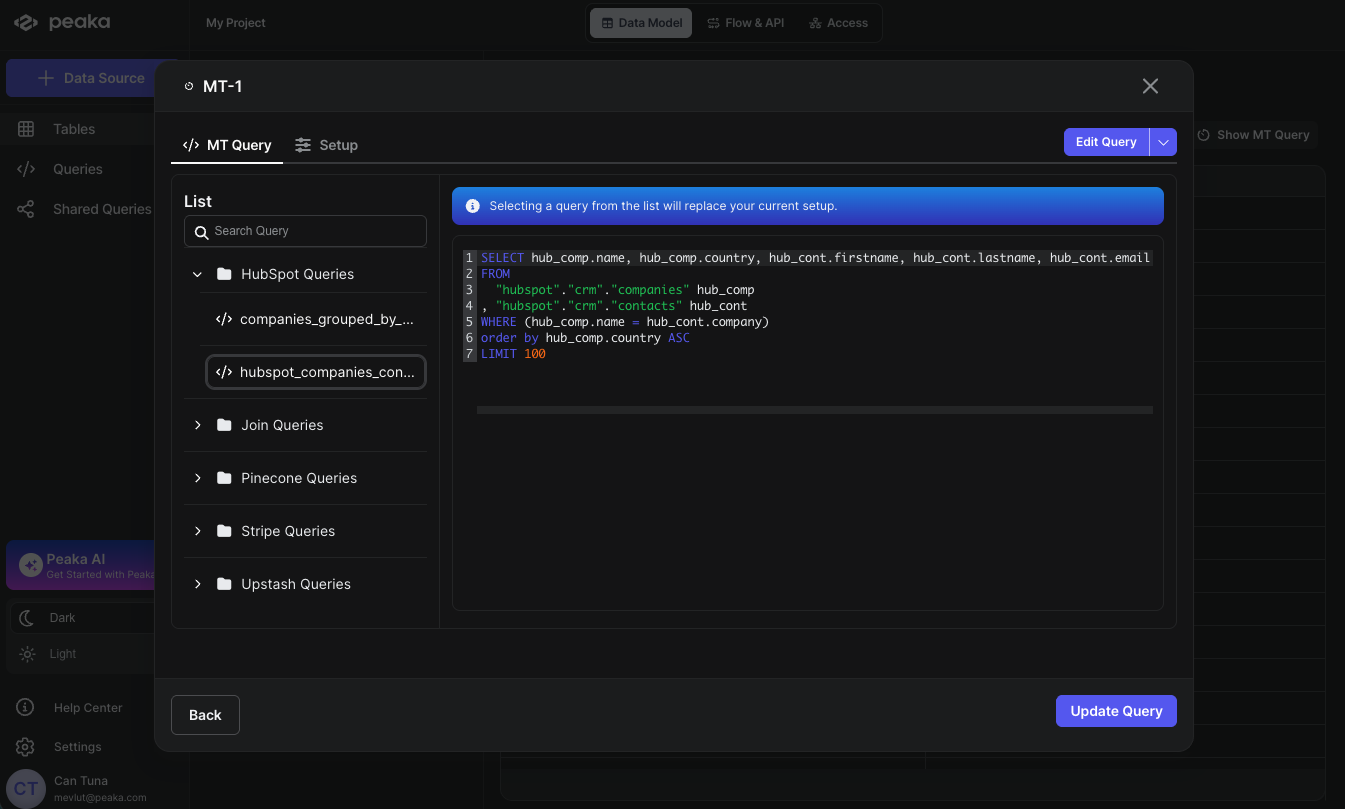 - A modal will open displaying the list of queries. Select the query you want to replace your materialized query with and click on the Update button.