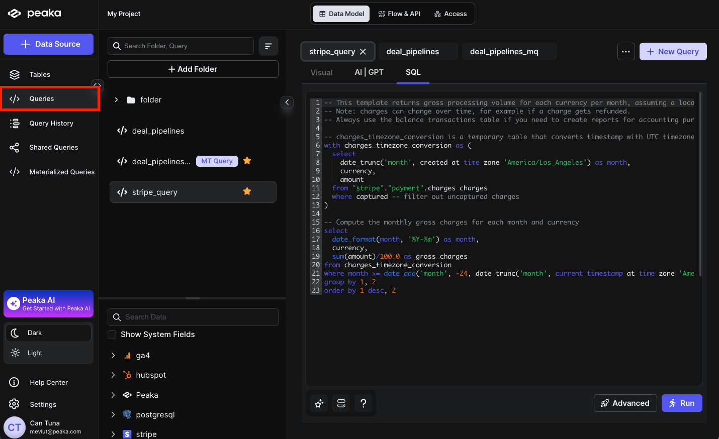 - Navigate to the Queries page in Peaka and select the query you want to use as the basis for your semantic catalog.