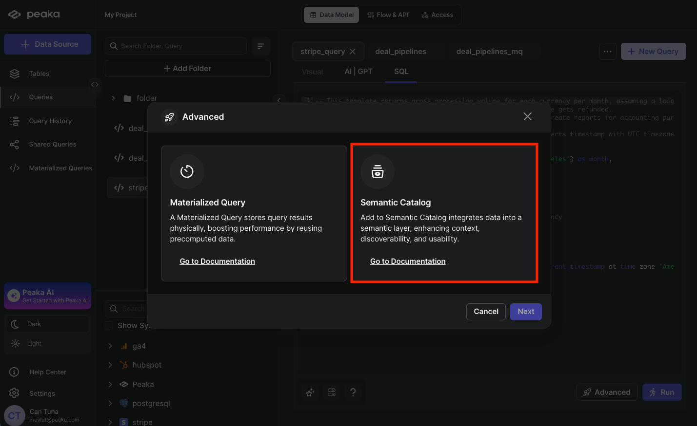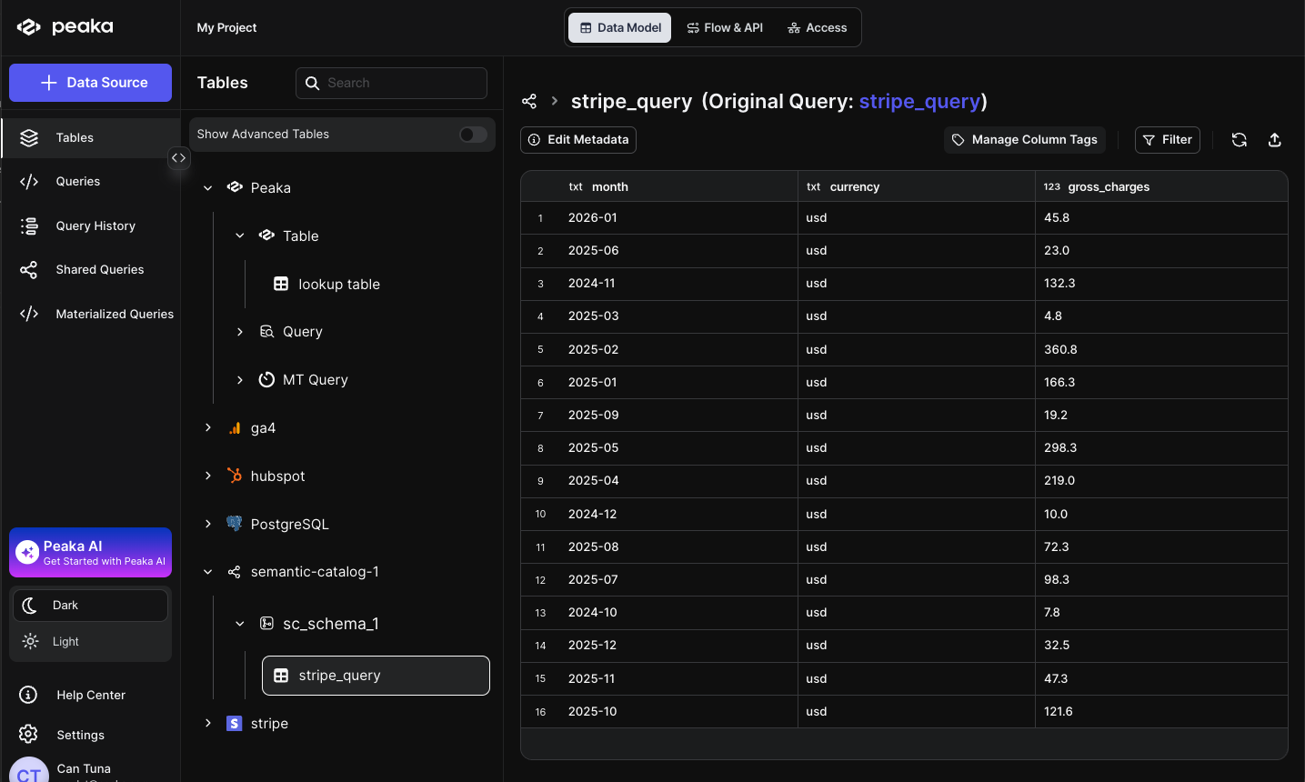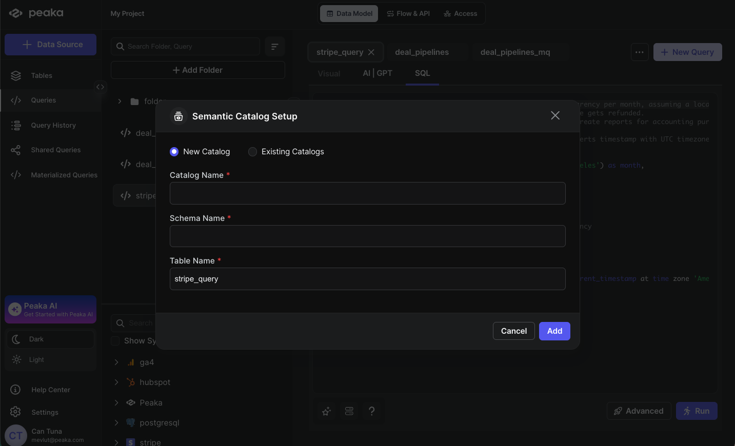 Semantic catalogs are created from SQL queries that you’ve already saved in Peaka. When you convert a query into a semantic catalog, it becomes a virtual table that appears in your Tables section. This table can be queried just like any other table in your catalog, but it’s powered by the underlying SQL query you defined. The key advantage is that semantic catalogs automatically reflect changes in your source data—when the underlying data updates, queries against your semantic catalog will return the latest information without requiring manual updates or data copying.Why semantic catalogs are useful