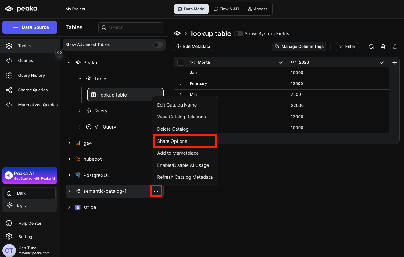 - Navigate to the Tables page in Peaka. Find your semantic catalog name in the list, click the three-dot menu (…), next to it, and select Share Options.