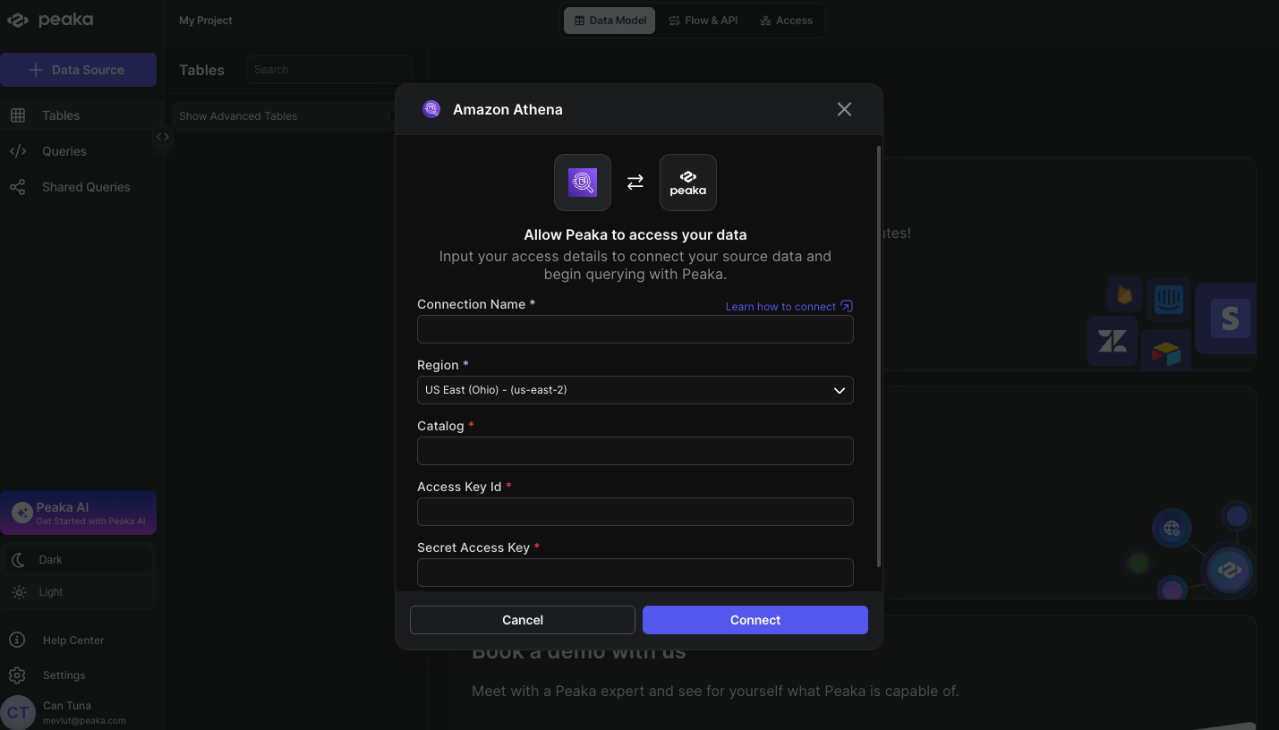 Now that you have obtained the necessary credentials, you can connect Amazon Athena to Peaka using the following steps:- Navigate to the data model page in Peaka.